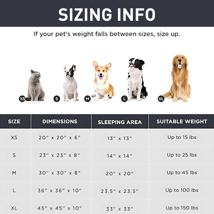 We offer multiple sizes to fit all breeds and weights. If you’re unsure, sizing up is always a safe choice—your dog will still feel snug and comfortable, even in a larger bed.